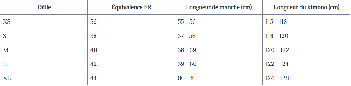 La ceinture permettant un ajustement personnalisé, seules la longueur du kimono et celle des manches varient selon les tailles.