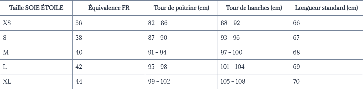 Parce que chaque détail compte, nous vous invitons à découvrir notre guide des tailles spécialement conçu pour nos nuisettes en soie. Ce guide vous aidera à choisir la coupe idéale, parfaitement adaptée à votre morphologie.
